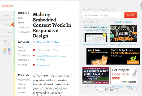 一个很牛逼的网页设计网站,有本书叫《众妙之门:网站UI设计之道》(很多小伙伴都知道吧!!)就是Smashing Magazine上线以来的精华总结 。