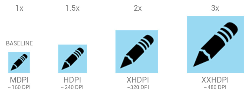 在Android应用中,以MDPI为基准界面尺寸,恰好对应上面提及的iphone应用的基准界面尺寸(320x480),所需的切图图标为iphone中对应的1倍图;XHDPI则对应2倍图,HDPI和XXHDPI可依此类推。