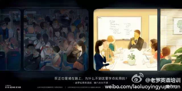 再一次用了摇滚乐来说事,只不过这次广告对准的是比摇滚青年们面积更广的上班族。咱们可以理解成那些看了迷笛音乐节上那则广告的人,来到「老罗英语培训」后,已经成功完成了角色转换。